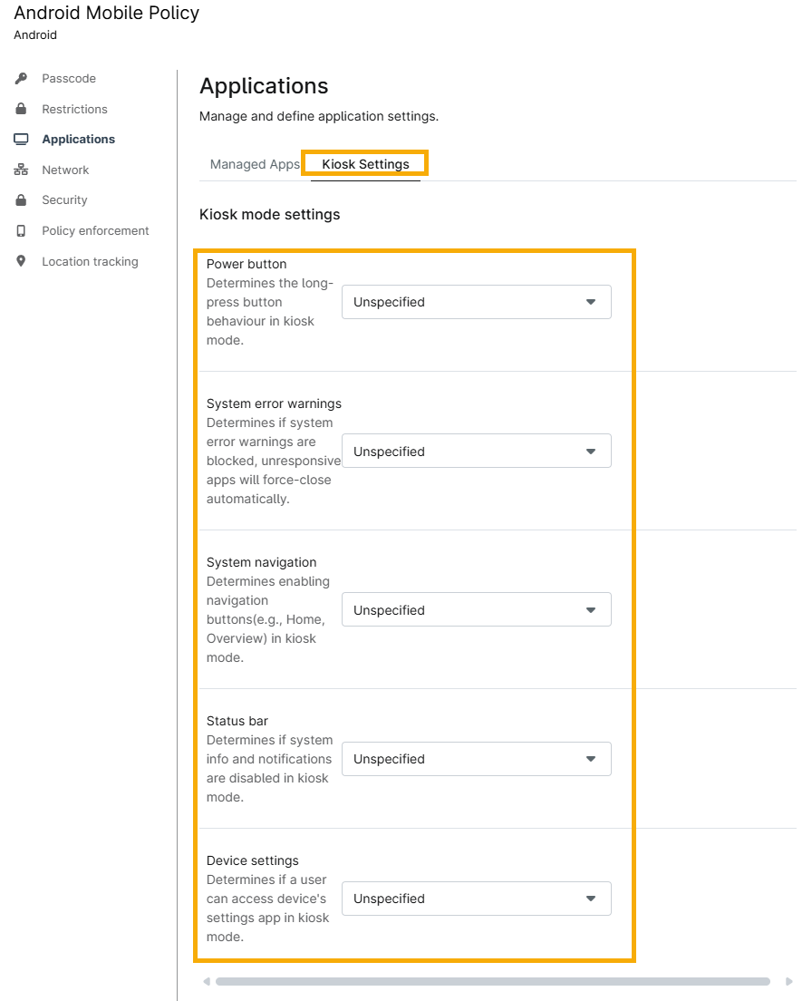 Dans la page Applications de la politique mobile Android, cliquez sur l'onglet Paramètres du kiosque, puis choisissez la fonctionnalité souhaitée dans les menus déroulants sous Paramètres du mode kiosque.
