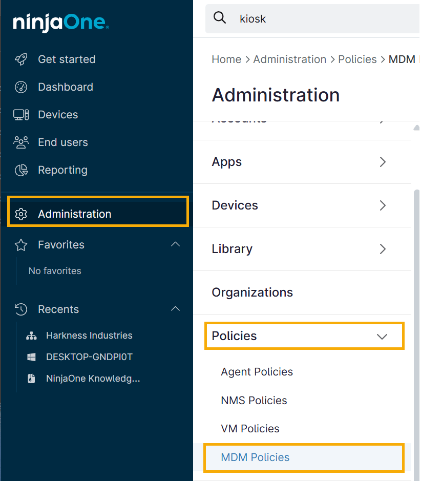 - Cliquez sur Administration dans le volet de navigation gauche, ouvrez l'onglet Politiques, puis cliquez sur Politiques MDM.