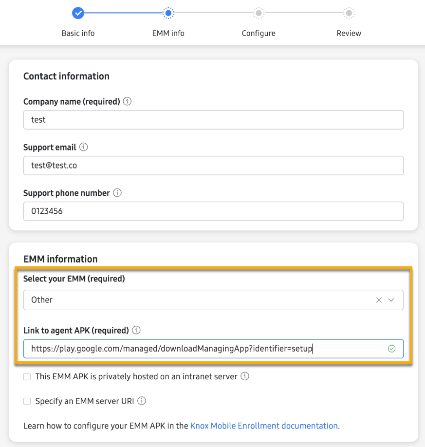 - Les options de configuration des informations EMM s'affichent. Saisissez les informations suivantes :