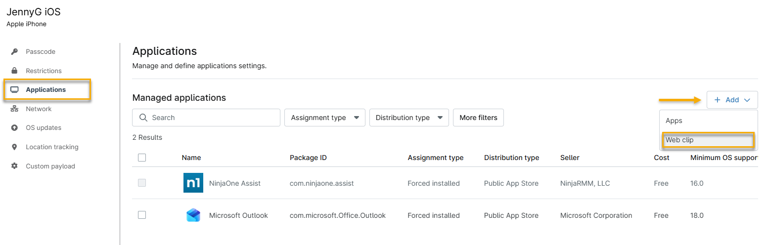 Cet article explique comment ajouter des clips Web à des appareils Apple iOS gérés via NinjaOne Mobile Device Management (MDM).