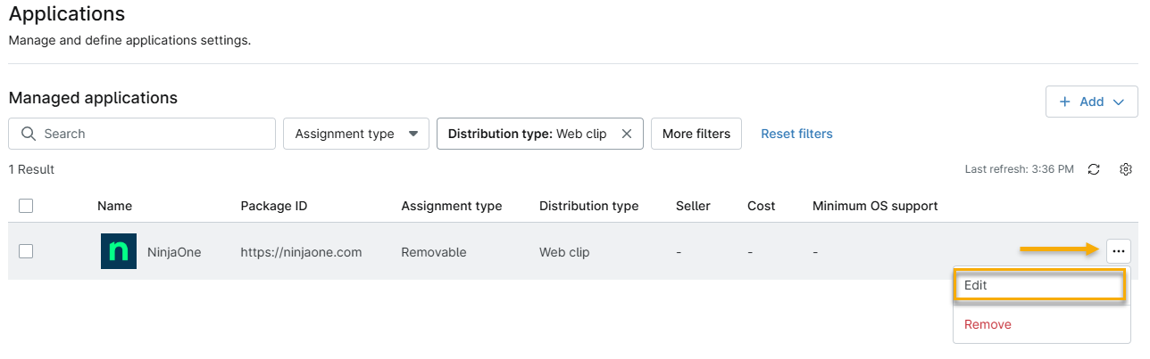 Dans la liste Applications, placez votre curseur sur le web clip, puis cliquez sur le menu ellipsis (trois points) lorsqu'il apparaît et sélectionnez Supprimer. NinjaOne vous demandera de confirmer la suppression du web clip.