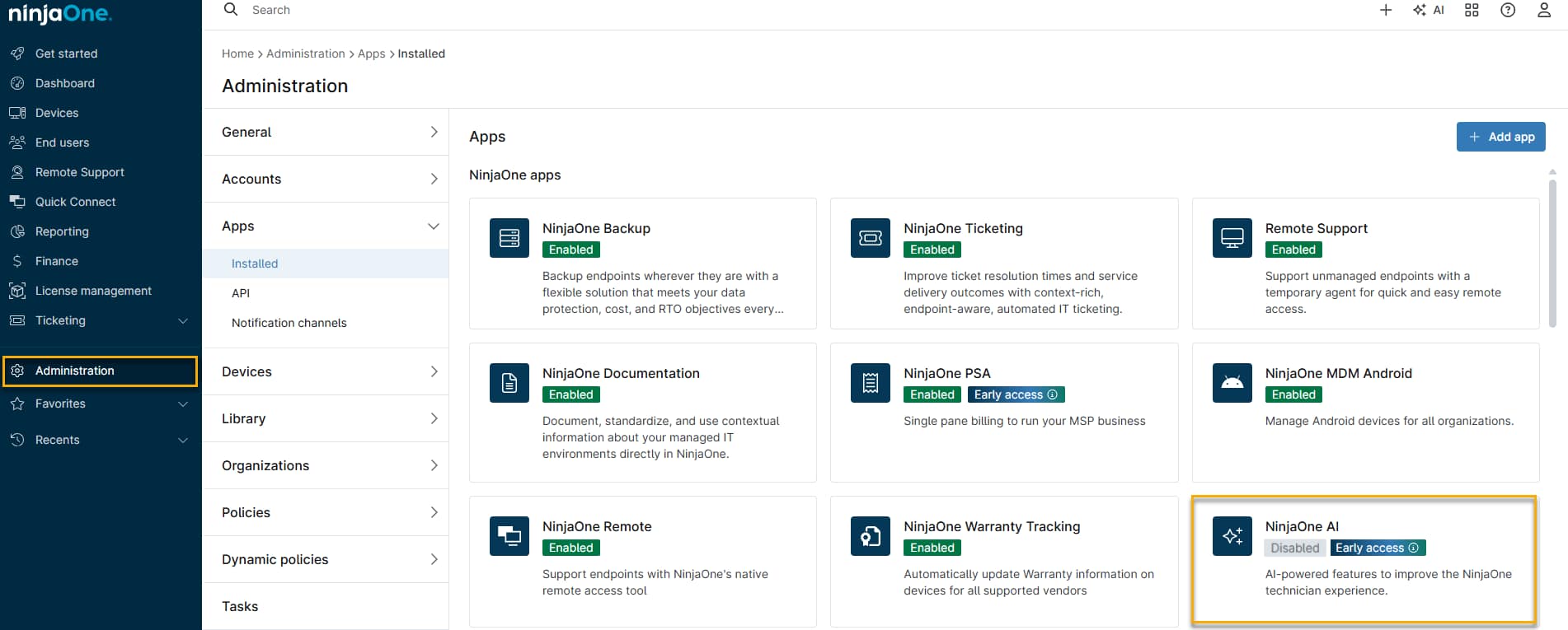 - Dans NinjaOne, naviguez vers Administration → Applications et cliquez sur l'application NinjaOne AI.