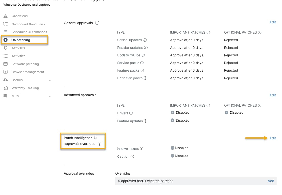 - La page de gestion de la police s'ouvre. Cliquez sur l'option de correction du système d'exploitation, faites défiler jusqu'à la section Patch Intelligence AI Approvals overrides, puis cliquez sur le lien Edit.