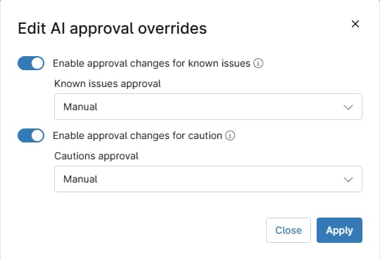 - La fenêtre Modifier les dérogations à l'approbation de l'IA s'ouvre. Activez les boutons pour activer la fonction. Vous pouvez choisir de déclencher l'annulation dans l'un ou l'autre des cas suivants, ou dans les deux :