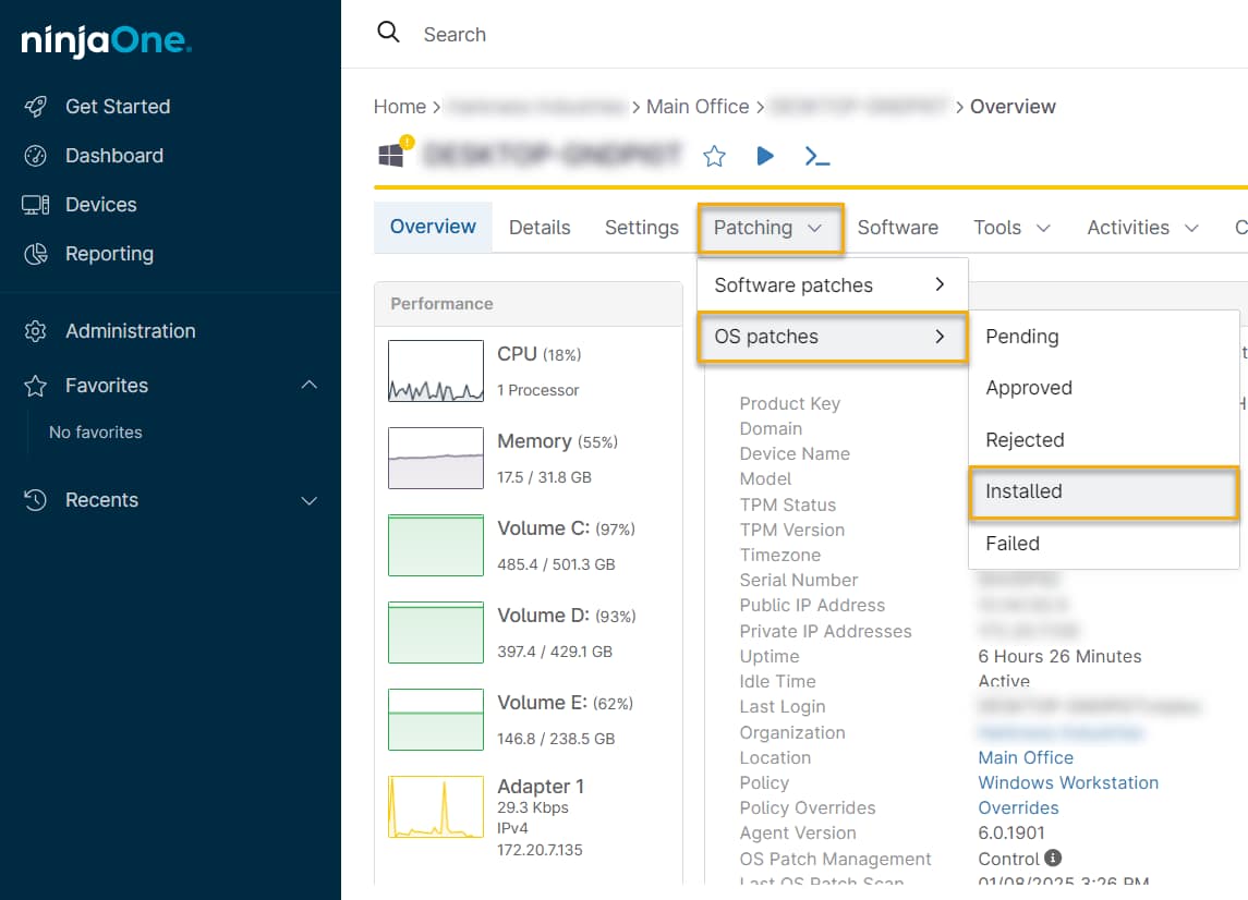 - Naviguez vers l'application NinjaOne Patching dans Administration → Apps → Installed → NinjaOne Patching.