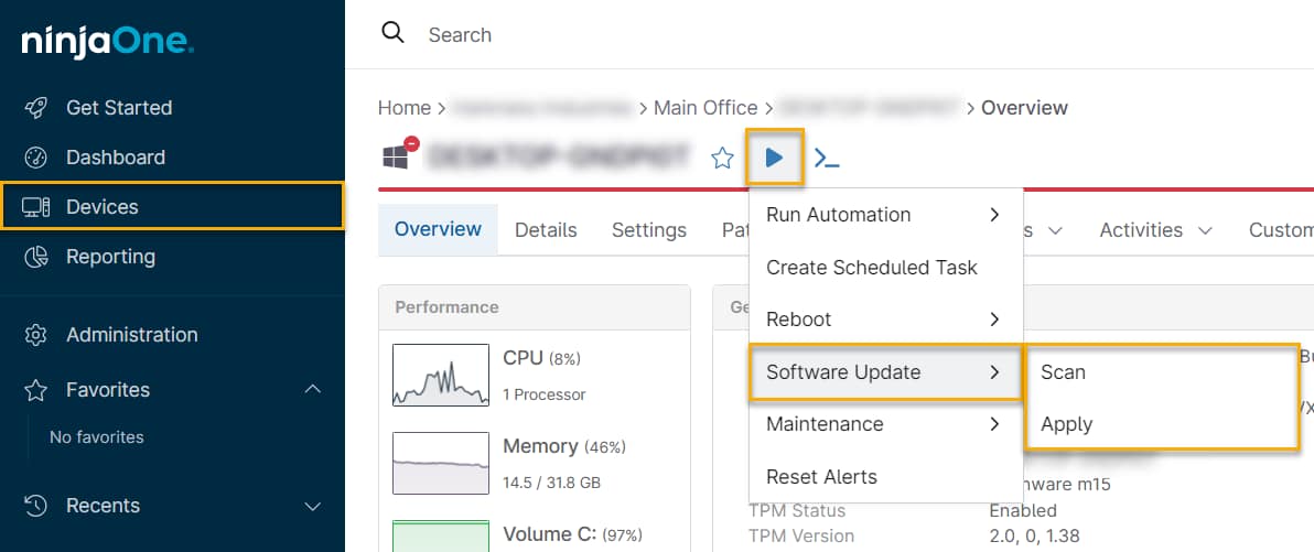 NinjaOne peut lancer un cycle d'analyse et de mise à jour des correctifs à la demande sur n'importe quel point de terminaison. NinjaOne installe toutes les mises à jour disponibles et redémarre l'appareil si nécessaire. Si un appareil n'a pas reçu de mise à jour depuis plus de 60 jours, plusieurs redémarrages peuvent être nécessaires pour appliquer toutes les mises à jour, car certaines dépendent de l'installation préalable d'autres mises à jour.