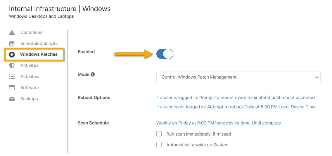 - Dans NinjaOne, accédez à Administration → Politiques → Correctifs Windows.