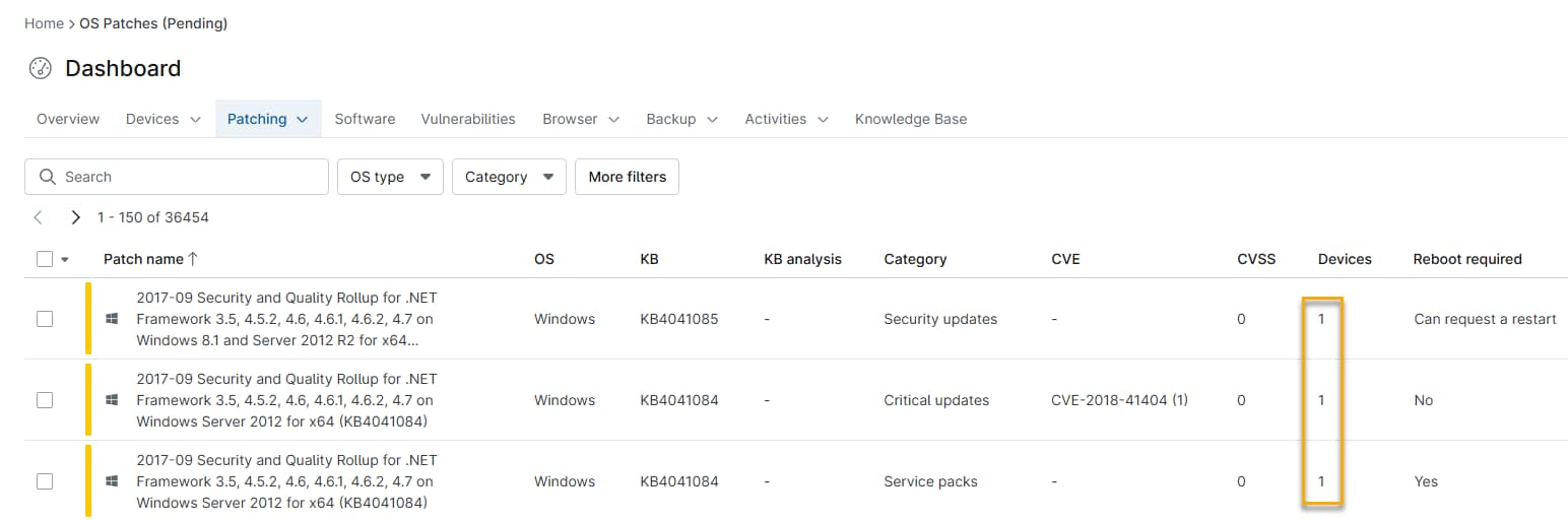 Au niveau du tableau de bord Système ou Organisation , vous pouvez cliquer sur le numéro de la colonne Dispositifs pour générer une liste des dispositifs auxquels s'applique l'état du correctif. Par exemple, en cliquant sur le numéro d'un correctif dans l'onglet Approuvé, on peut voir les appareils pour lesquels il est approuvé (mais pas encore installé).