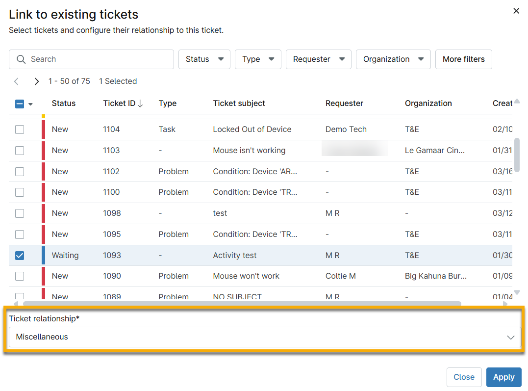 Lorsque vous liez un ticket à un autre ou que vous attribuez un ticket parent, définissez la relation entre les tickets en sélectionnant une option dans le menu déroulant Relation entre les tickets . Si vous devez créer une nouvelle relation, vous pouvez le faire à partir de la page de configuration NinjaOne Ticketing, sous l'onglet Personnalisé → Relations , si vous disposez des autorisations appropriées. Pour en savoir plus, consultez NinjaOne Ticketing : installation et configuration.