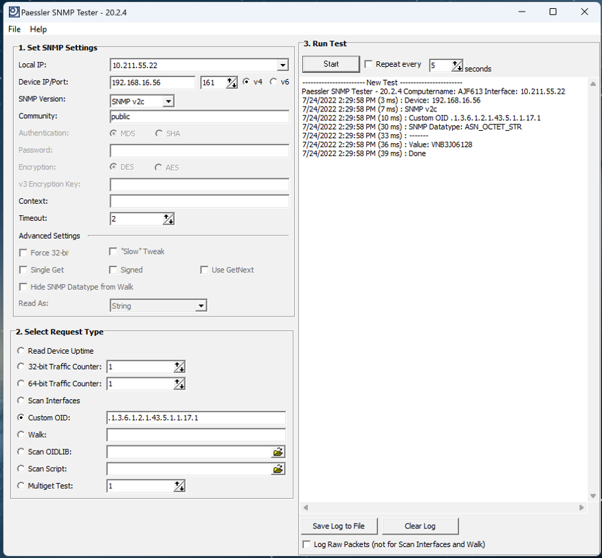 - Dans le champ OID personnalisé, ajoutez un OID à tester, puis cliquez sur Démarrer dans le panneau Exécuter le test.