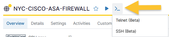 En haut du tableau de bord de l'appareil du SGN, à droite du nom de l'appareil et du bouton d'action pour le mode maintenance, placez le curseur sur l'icône du terminal (>_) pour voir les options Telnet et SSH.