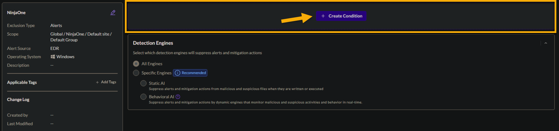 Un résumé des détails de l'exclusion s'affiche avec la possibilité de créer des conditions et de définir des moteurs de détection spécifiques.