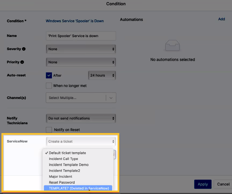 Utilisez les modèles d'incident pour créer des tickets lorsqu'une condition est déclenchée. Pour savoir comment définir une condition, consultez la section Politiques : configuration des conditions.