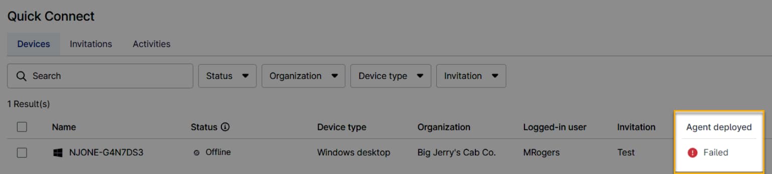 | Échec | Impossible d'installer l'agent NinjaOne. Les échecs affichent la cause lorsque vous passez le pointeur de la souris sur l'état. Cliquez sur la ligne de l'appareil pour afficher les détails. Vous pouvez supprimer le dispositif ou tenter de déployer à nouveau l'agent. |