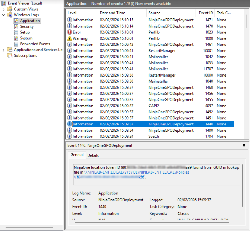 Si vous avez sélectionné « Activer la journalisation des événements », le script enregistrera les événements dans le journal des événements de l'application avec la source NinjaOneGPODeployment tout au long du processus. Dans la figure 6 ci-dessous, notez la source NinjaOneGPODeployment dans le journal des événements de l'application :