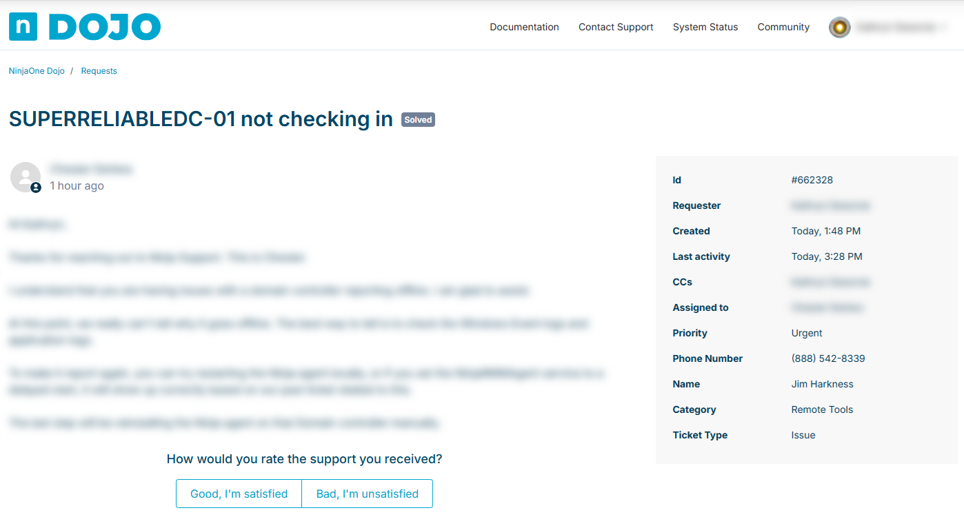 Après la résolution d'un ticket, vous pourrez soumettre un feedback basé sur votre expérience avec l'équipe NinjaOne et laisser un commentaire.