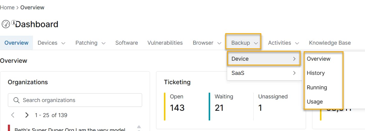 Pour accéder au tableau de bord global des sauvegardes, cliquez sur Tableau de bord dans le menu de navigation principal de NinjaOne, puis sélectionnez Sauvegarde dans le menu en haut de la page. Placez votre curseur sur Appareil dans le menu déroulant ; le menu affichera alors quatre options différentes : Aperçu, Historique, En cours et Utilisation.