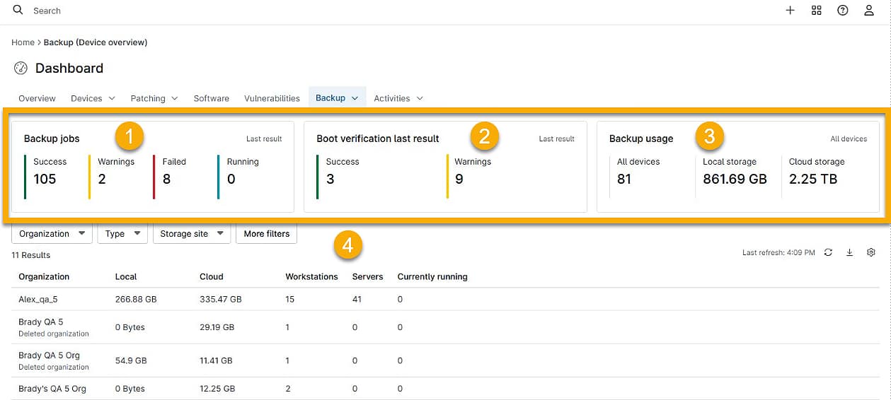 - Depuis le tableau de bord global, cliquez sur le nom de l'organisation pour accéder à la page Sauvegarde → Aperçu de l'organisation. Depuis le tableau de bord de l'organisation, cliquez sur le nom d'un appareil pour accéder à la page Sauvegarde → Aperçu de l'appareil.
