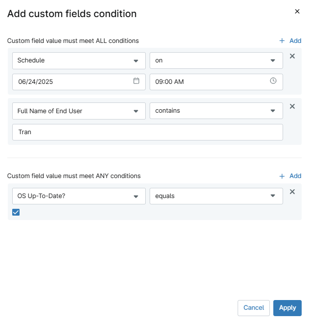 - Sélectionnez Champs personnalisés dans le menu déroulant Ajouter une condition.