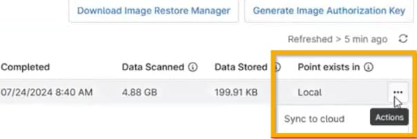Bien qu'ils ne fassent pas strictement partie d'un plan de sauvegarde, les plans de conservation horaire des images offrent la possibilité de synchroniser manuellement des révisions spécifiques vers le nuage. Vous pouvez accéder à cette option en accédant à Sauvegarde → Appareil → Gérer à partir du tableau de bord de l'appareil.