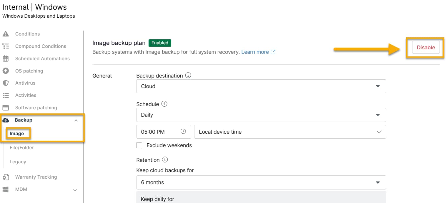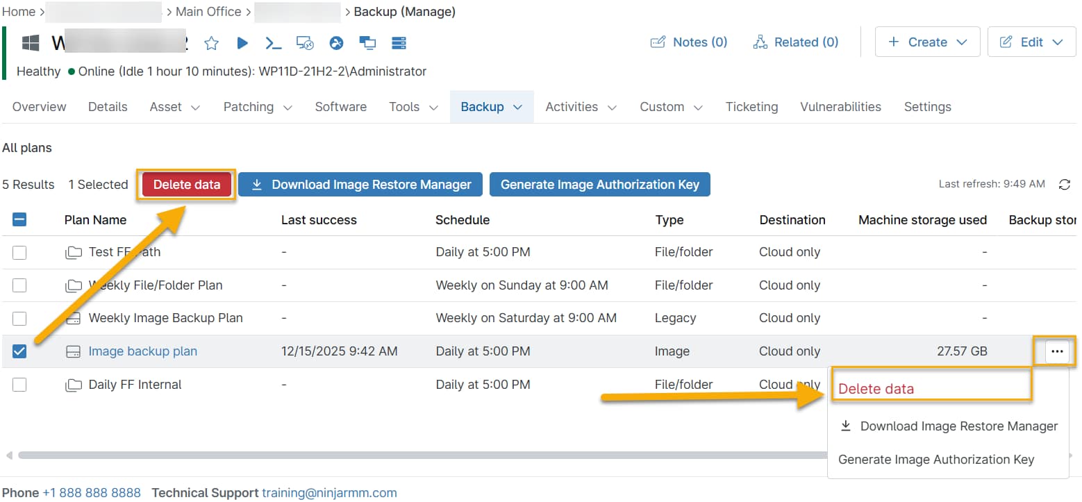 NinjaOne ne supprime pas les données de sauvegarde lorsqu'un plan de sauvegarde d'image est désactivé au niveau de la politique. Vous devez supprimer les données pour chaque appareil comme décrit dans la section Supprimer les données de sauvegarde au niveau de l'appareil ci-dessus.