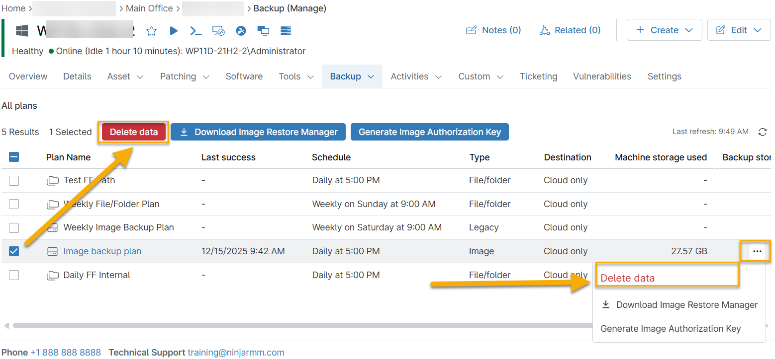 - Vous ne pouvez pas récupérer les données de sauvegarde supprimées.NinjaOne conserve les données de sauvegarde que vous avez sélectionnées pour suppression pendant 72 heures avant de les supprimer définitivement. Si vous pensez avoir sélectionné les mauvaises données pour suppression, contactez immédiatement l'assistance NinjaOne.