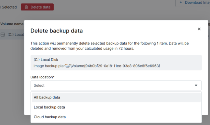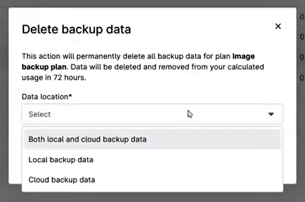 - Si vous disposez de données de sauvegarde stockées localement et dans le cloud, et que l'appareil est toujours en ligne, vous aurez la possibilité de supprimer les données locales, celles du cloud, ou les deux.