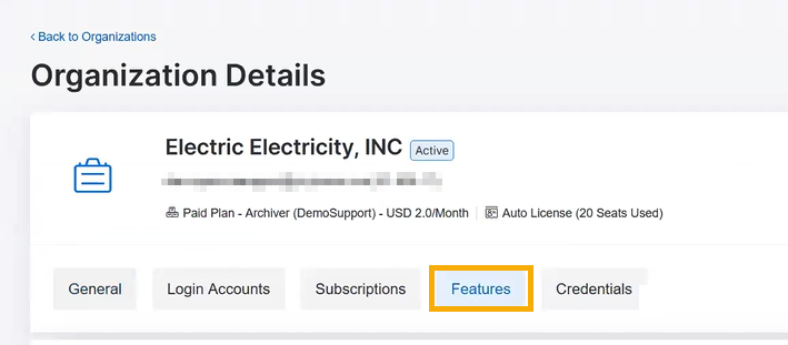 - Dans le portail de sauvegarde NinjaOne SaaS, naviguez jusqu'à l'organisation que vous souhaitez sauvegarder et cliquez sur l'onglet Fonctionnalités.