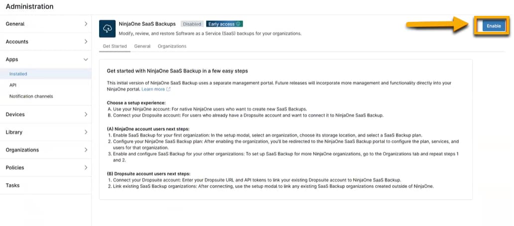 - Dans NinjaOne, accédez à Administration → Applications → NinjaOne SaaS Backup.