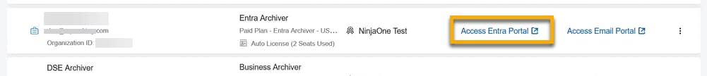 - Connectez-vous au portail Entra. Dans la section Organisations du portail des partenaires, sélectionnez Accéder au portail Entra. Il est important de noter que les organisations ne peuvent pas accéder à cette option. Seuls les revendeurs peuvent gérer les sauvegardes Entra pour le compte de leurs organisations.