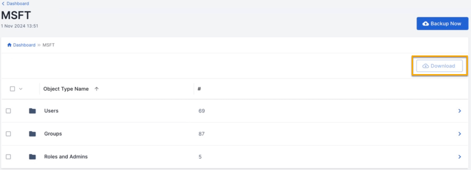 Le bouton Télécharger génère un fichier .zip contenant les données sélectionnées au format JSON. Vous pouvez télécharger des objets spécifiques, tous les objets d'un type particulier (tels que les utilisateurs ou les groupes) ou tous les objets actuellement sauvegardés.