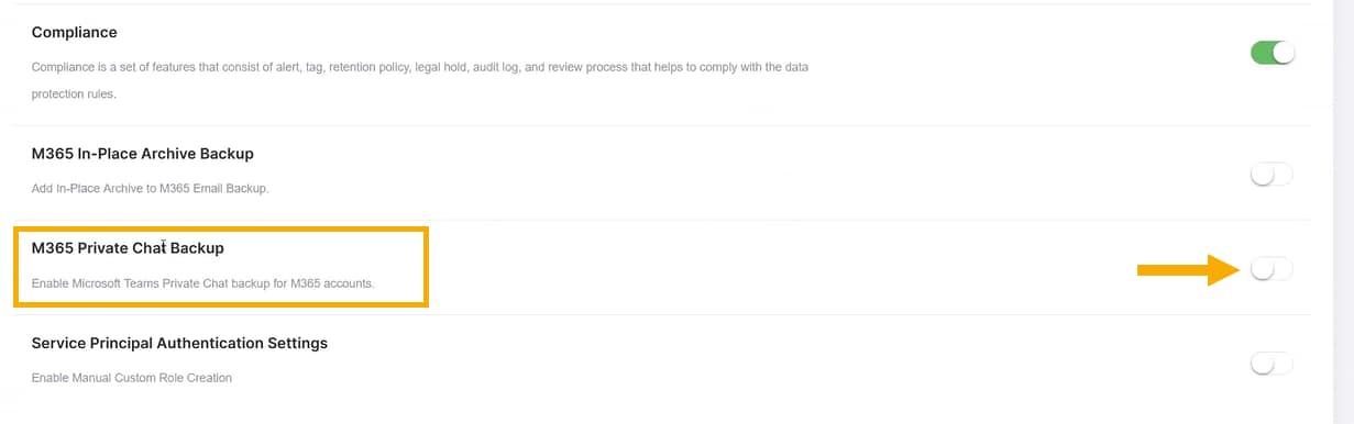 - Scorrere fino a M365 Private Chat Backup e attivare l'interruttore su enabled.