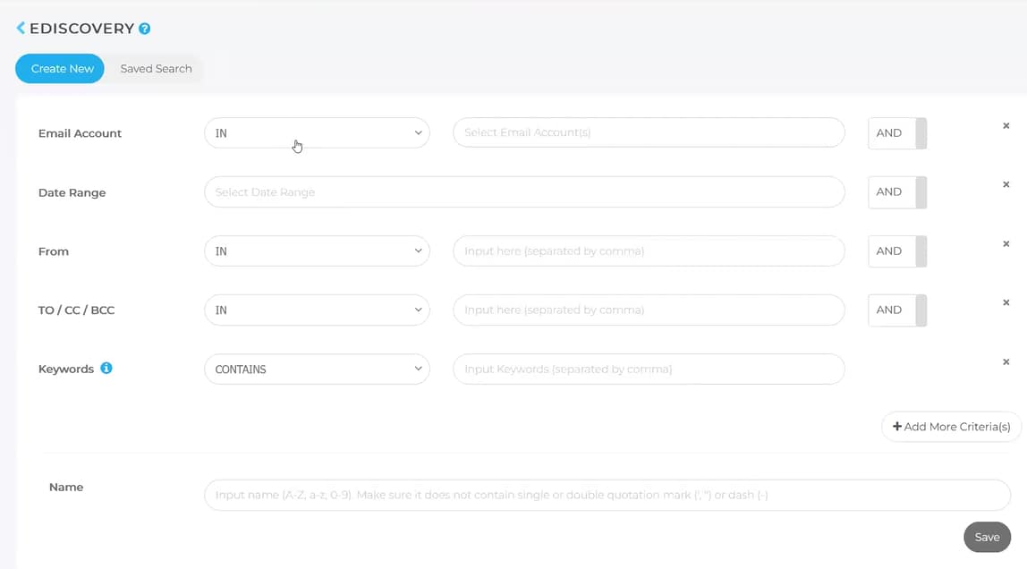la ricerca eDiscovery dispone di menu aggiuntivi per salvare i criteri di ricerca, visualizzare in anteprima i risultati della ricerca nelle e-mail e modificare i criteri di ricerca. È possibile impostare avvisi, TAG (che cos'è un TAG?) e processi di revisione sui risultati della ricerca eDiscovery, mentre non è possibile eseguire queste funzioni con la ricerca avanzata.