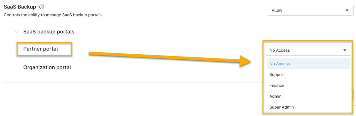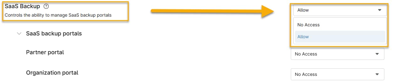 Queste impostazioni controllano l'accesso a NinjaOne SaaS Backup o al portale partner Dropsuite. Le opzioni sono: