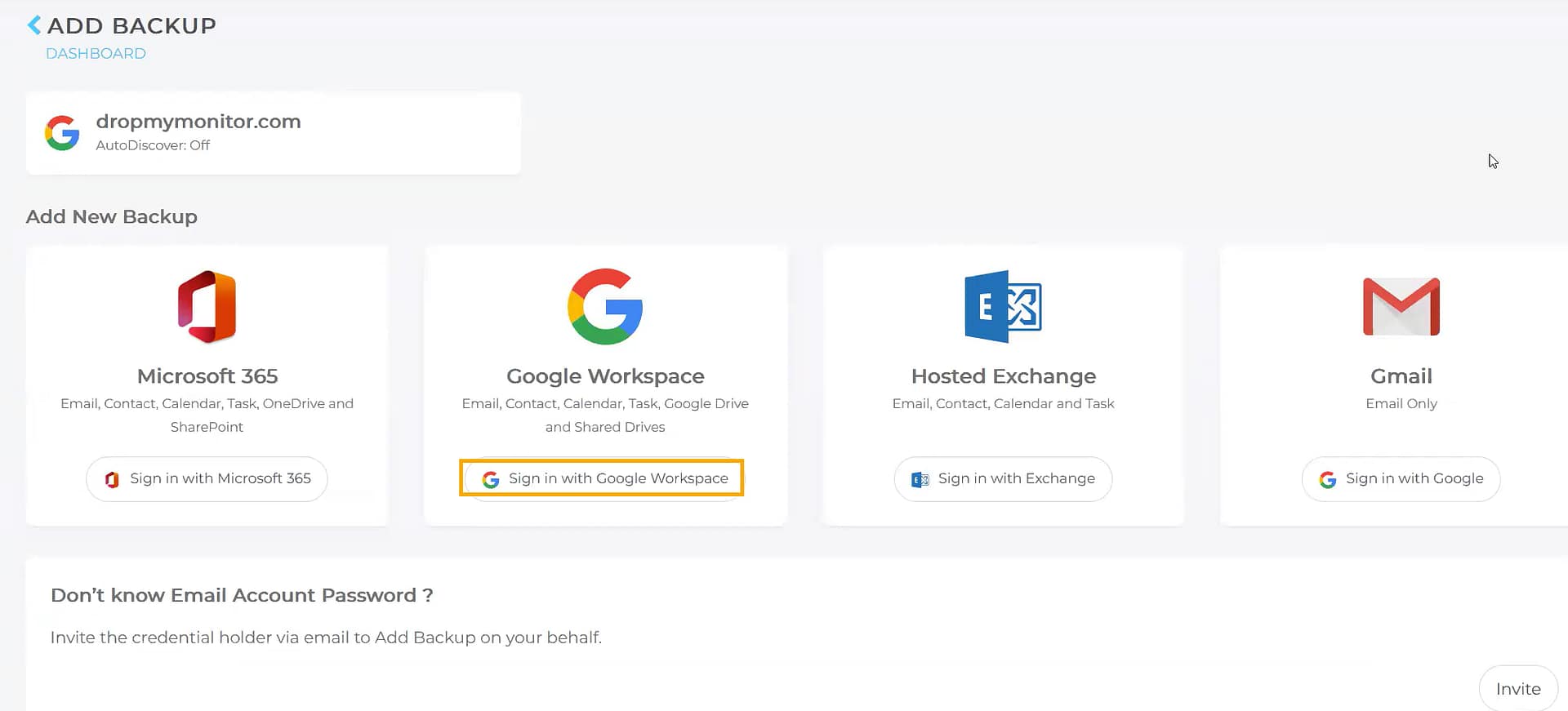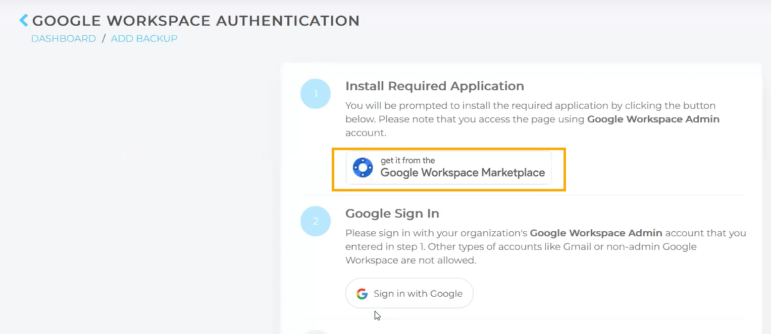 - Passare all'organizzazione per la quale si desidera eseguire il backup di Google Workspace e fare clic su Aggiungi backup.