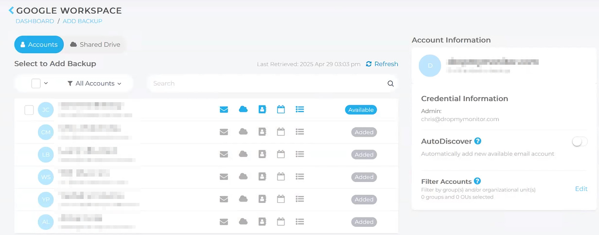 Dopo aver attivato Backup per Google Workspace, seguite questi passaggi per specificare gli account di cui eseguire il backup.