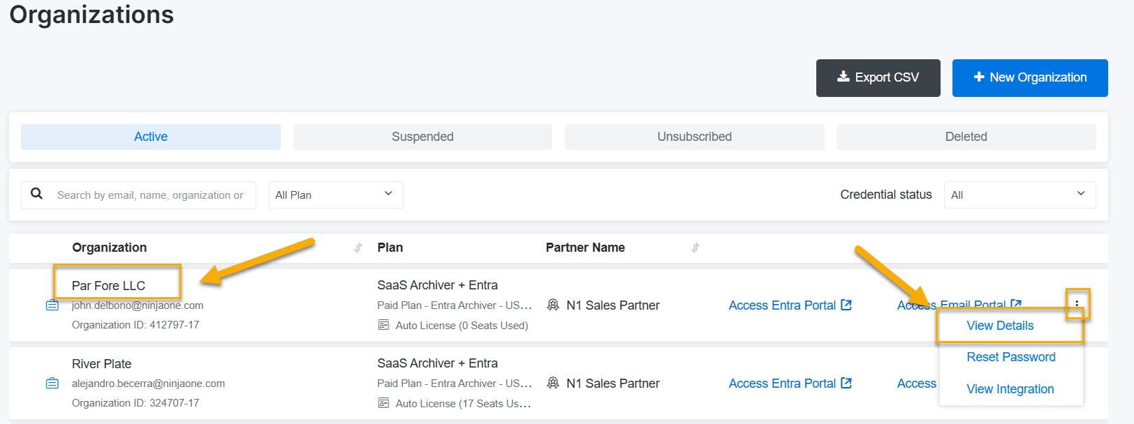 Per visualizzare i dettagli di un'organizzazione, fare clic sul nome dell'organizzazione nell'elenco o fare clic sul pulsante Visualizza dettagli nel menu a discesa Azione (tre puntini) alla fine dell'elenco delle organizzazioni. Non è possibile visualizzare i dettagli dell'organizzazione se lo stato dell'abbonamento è stato eliminato.