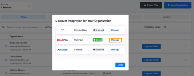 - Viene visualizzata una finestra di dialogo a comparsa che mostra tutte le integrazioni collegate. Spostarsi su HaloPSA e scegliere Gestione.