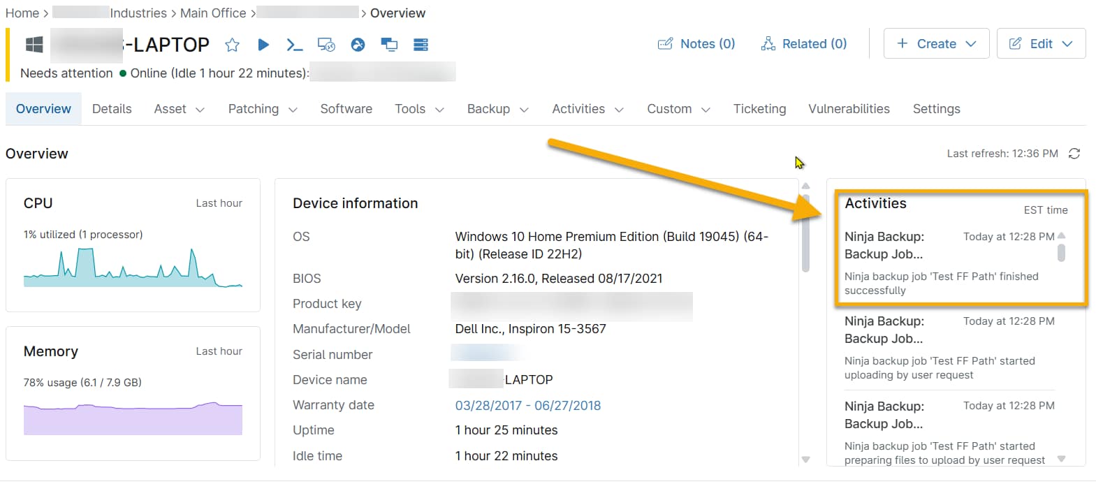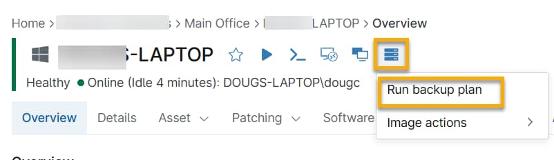 - Dalla dashboard di NinjaOne, passare alla pagina di panoramica del dispositivo su cui si desidera eseguire il backup.