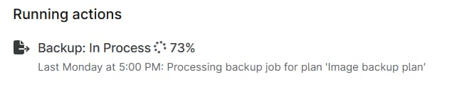 La sezione Azioni in esecuzione mostra tutte le azioni attualmente in esecuzione sul dispositivo e il loro stato di avanzamento. Indica anche quando NinjaOne ha eseguito l'ultimo backup per il dispositivo.