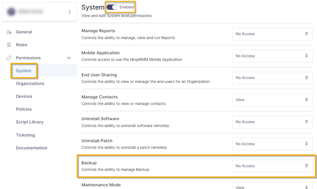 Gli amministratori di sistema di NinjaOne hanno accesso a NinjaOne Backup per impostazione predefinita. Solo loro possono attivare o disattivare NinjaOne Backup a livello di sistema. È inoltre possibile assegnare livelli di backup a utenti personalizzati. Per farlo, esegui le seguenti operazioni:
