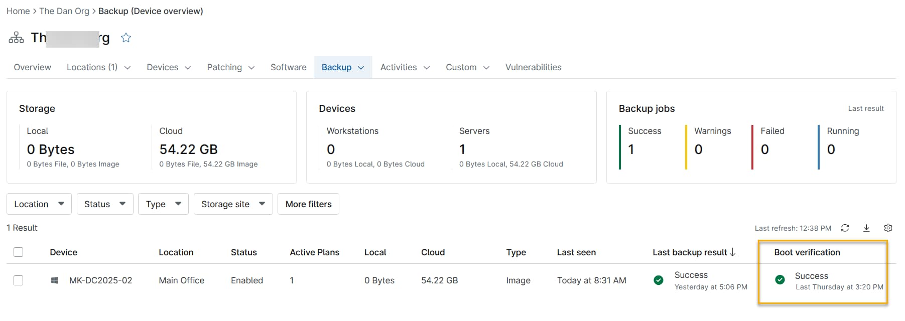 - Si aprirà la pagina di panoramica del backup. Lo stato della verifica di avvio appare nell'ultima colonna. I risultati dello stato della verifica di avvio saranno visibili solo se è stata eseguita sul dispositivo.