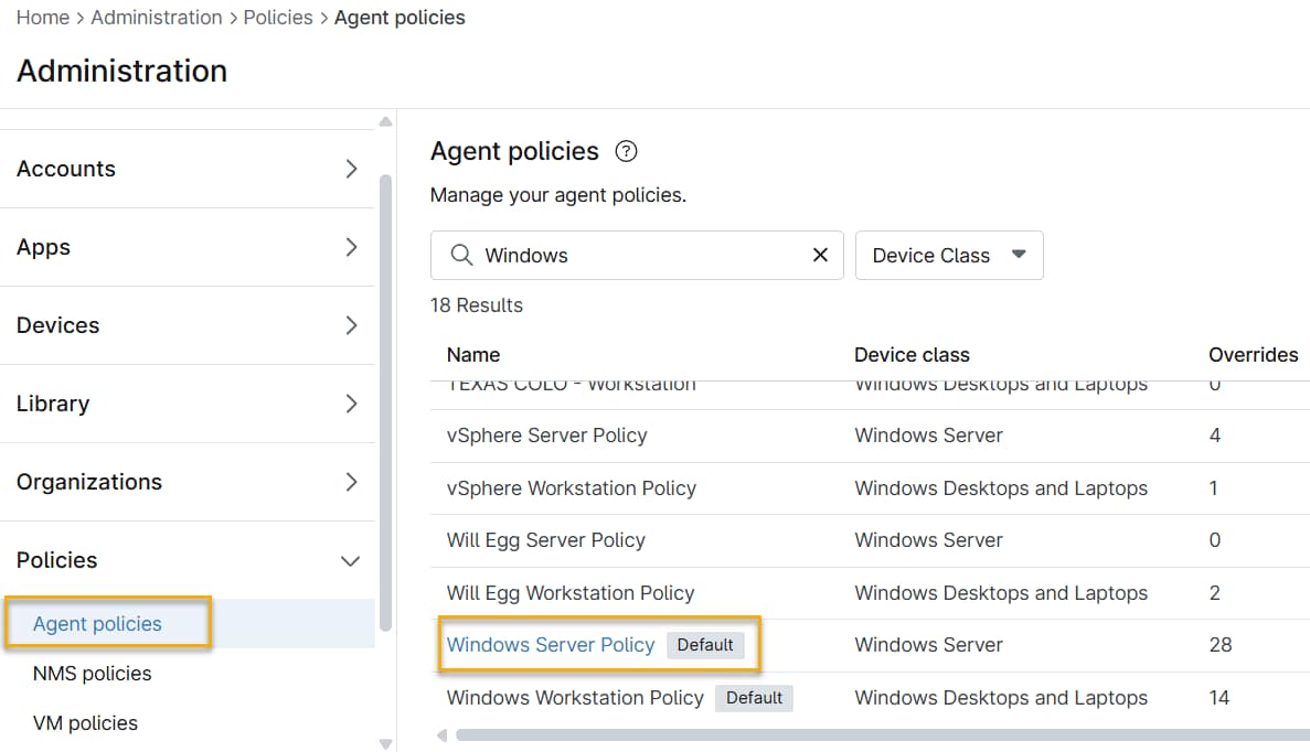 Selezionare Politiche → Politiche agente e selezionare Politica Windows Server.