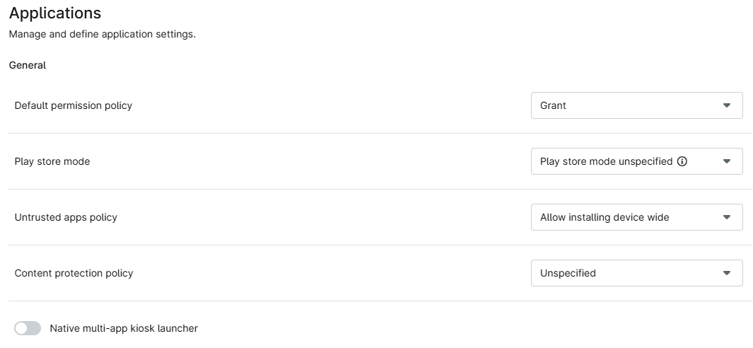 In Impostazioni generali, è possibile configurare il criterio per impostare per tutte le applicazioni aggiunte al dispositivo.