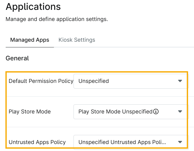 La sezione Applicazioni della politica mobile Android ha due schede: App gestite e Impostazioni chiosco.