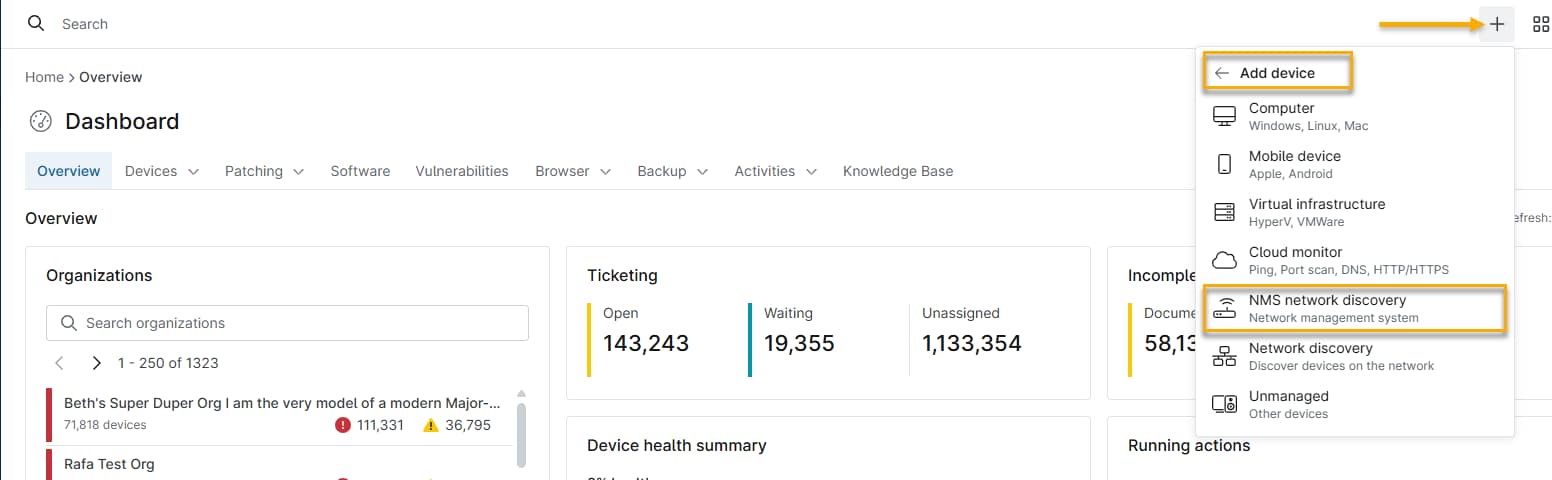 - Nella sezione superiore destra della console NinjaOne, fare clic sull'icona + e selezionare Esegui rilevamento rete NMS.