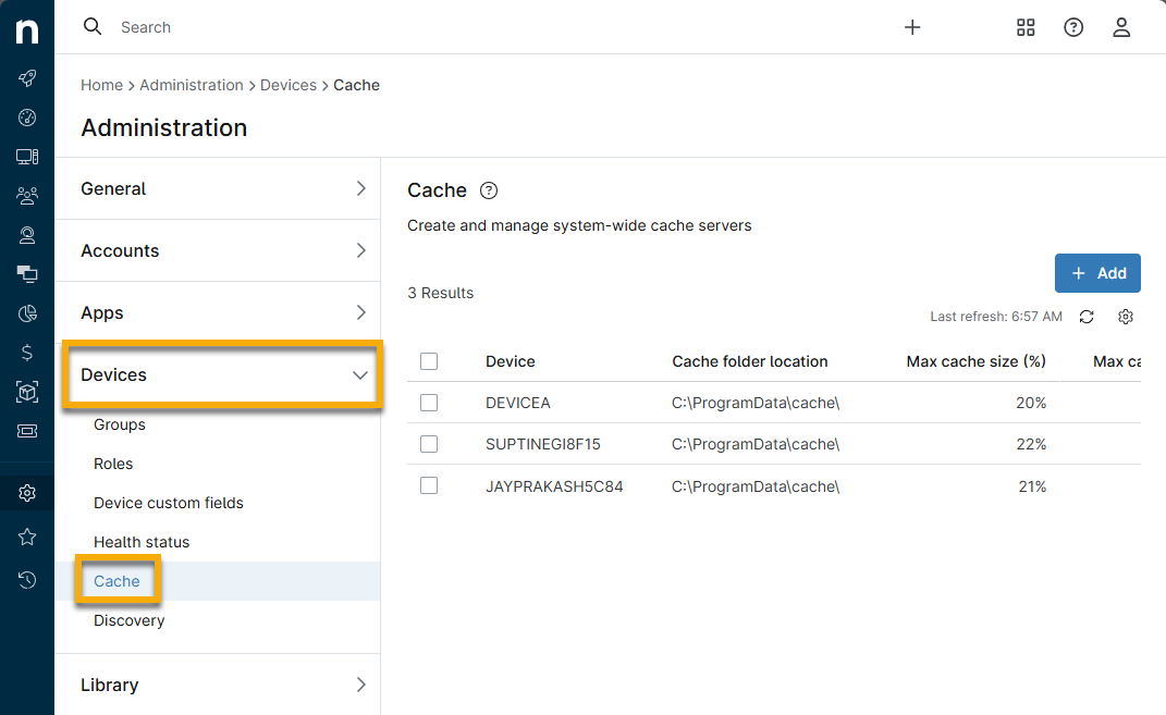 - In NinjaOne, navigare in Amministrazione → Dispositivi → Cache.