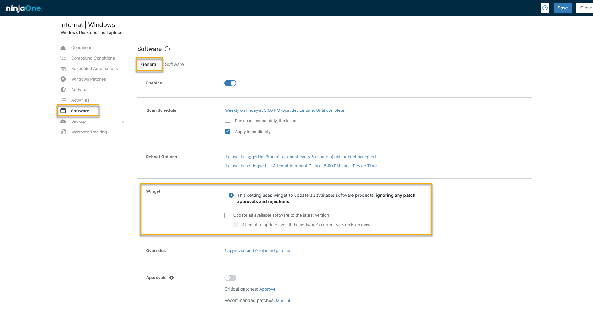 Prima di poter utilizzare WinGet, è necessario attivare l'applicazione in NinjaOne.