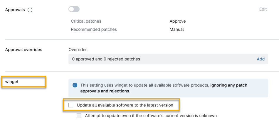 WinGet è lo strumento a riga di comando per il gestore di pacchetti di Windows. In NinjaOne, l'integrazione WinGet installa e aggiorna le applicazioni su Windows 10 e versioni successive e configura le impostazioni delle patch per il software selezionato. NinjaOne attualmente supporta WinGet versione 1.8.