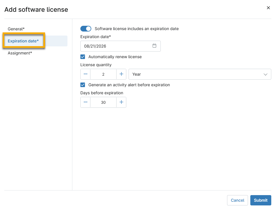 Campo Descrizione o scopo Nome della licenza software Aggiungere un identificatore unico. Tipo di licenza Se si seleziona un'opzione diversa da "Personalizzato", nella maschera di configurazione apparirà una nuova sezione intitolata Assegnazione. Per ulteriori informazioni, fare riferimento a Assegnazione della licenza software in questo articolo. Editore Il menu a discesa potrebbe essere vuoto la prima volta che si utilizza la dashboard Gestione risorse, anche se NinjaOne tenterà di identificare i produttori installati per il dispositivo. Fare clic su Aggiungi editore per aggiungere le informazioni. Una volta aggiunto, questo nome apparirà come opzione nel menu a discesa per le licenze future. Fornitore Il menu a discesa potrebbe essere vuoto al primo utilizzo della dashboard Gestione risorse. Fare clic su Aggiungi fornitore per aggiungere le informazioni. Una volta aggiunto, questo nome apparirà come opzione nel menu a discesa per le licenze future. Ambito di applicazione della licenza Selezionare Globale per includere tutte le organizzazioni e le sedi. Selezionare Limited per selezionare organizzazioni e sedi specifiche da un menu a discesa. Se si limita l'ambito a organizzazioni specifiche, è possibile assegnare solo i dispositivi associati all'organizzazione. Inoltre, le informazioni sulla licenza vengono visualizzate nella dashboard dell'organizzazione in Asset → Licenze. Quantità acquistata Fare clic su Modifica per aggiornare l'importo. Utilizzo della licenza Questo campo appare solo se si seleziona "Personalizzato" per il tipo di licenza. Fare clic su Modifica per aggiornare il numero di licenze in uso. Data di acquisto Inserire la data di acquisto delle licenze. - Aprire la sezione Data di scadenza e fare clic sull'interruttore se la licenza software ha una data di scadenza. Verranno visualizzati nuovi campi che consentiranno di inserire le informazioni e di selezionare se si desidera rinnovare automaticamente la licenza o impostare un avviso.